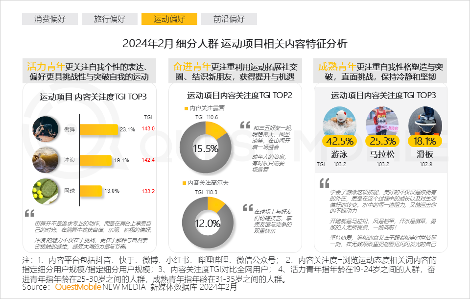 2、活力青年更愿意“为喜爱”买单,奋进青年偏好社交型运动,成熟青年注重对品质生活的打造