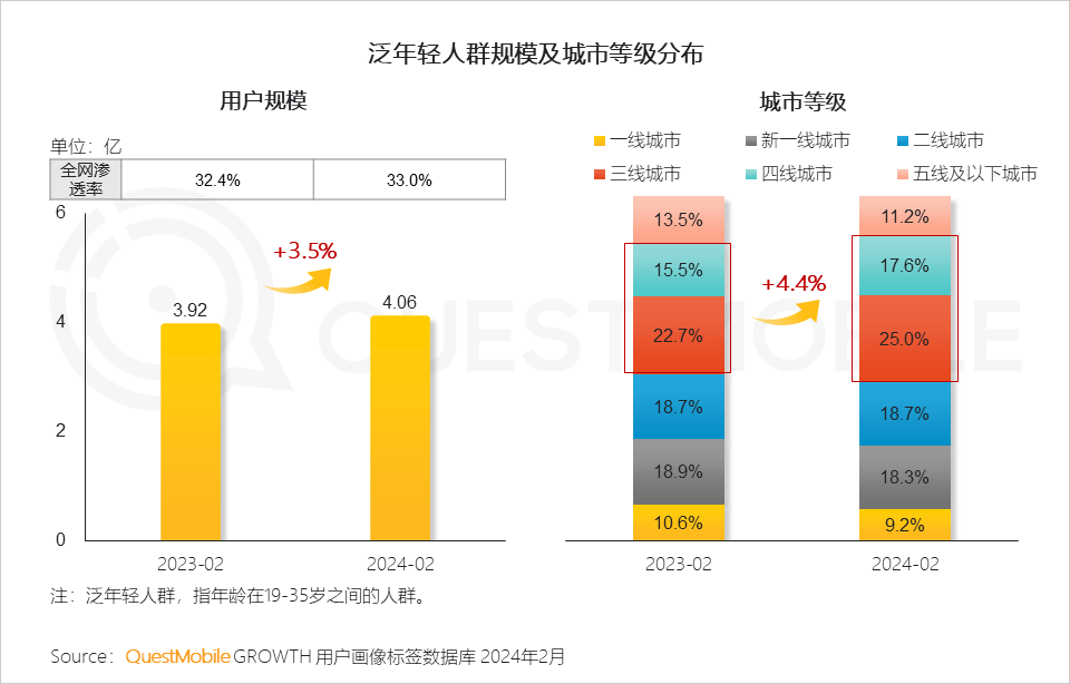 1.1 整体泛年轻人群规模超4亿,人群规模及全网渗透率趋于小幅增长,三四线城市对年轻人群吸引力增强