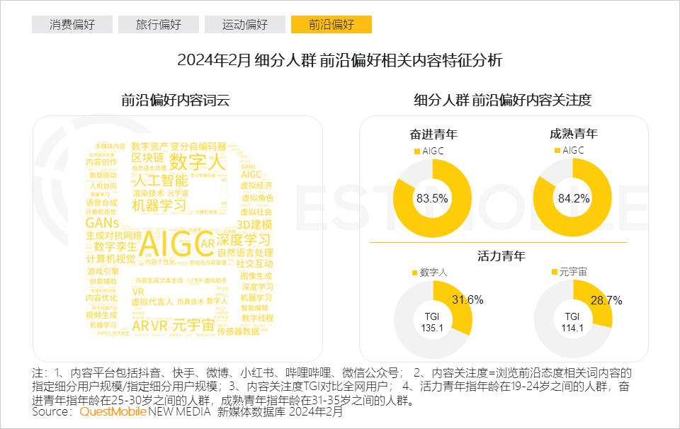 2.7 奋进青年与成熟青年,更追随当下热议前沿话题,如AIGC;活力青年更偏好数字人、元宇宙
