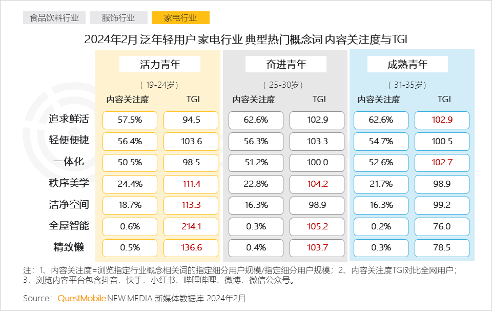 活力青年借助生活电器与个护小家电,实现自身形象和生活的精致管理;奋进青年通过生活类电器营造舒适的室内环境;成熟青年则倾向打造当代厨房,推动建立更健康的家庭饮食模式。
