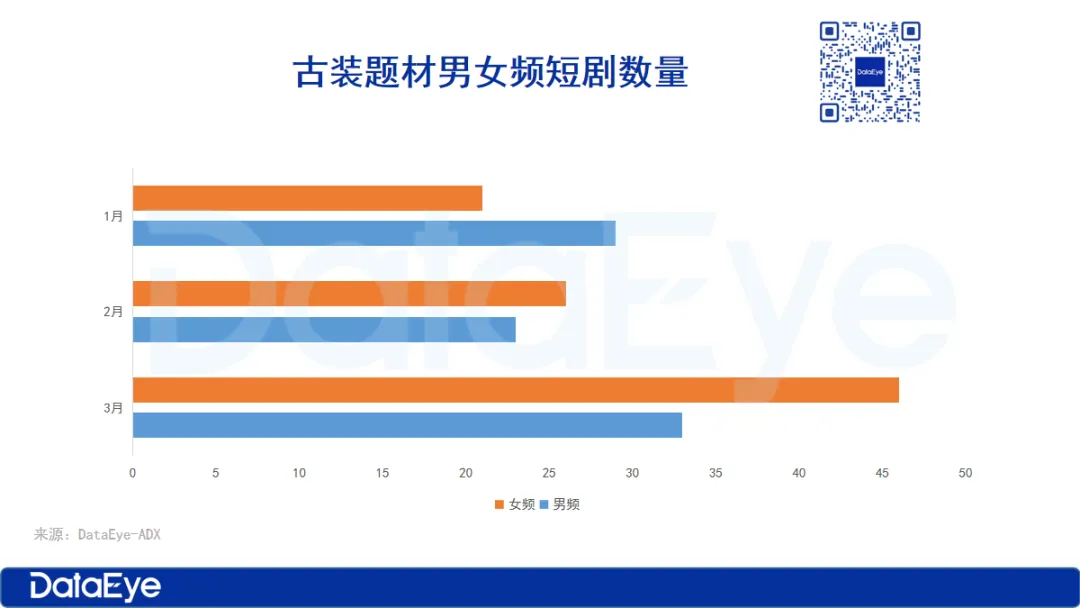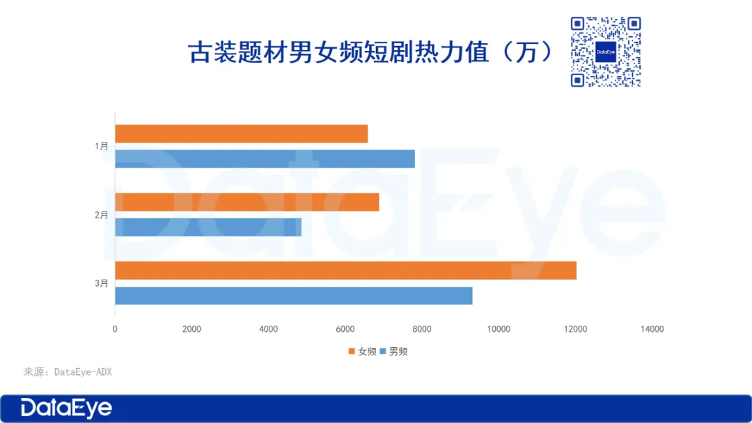 与短剧数量呈现同样趋势,3个月以来男频古装题材短剧的热力值变动不大,只有2月略有下降。