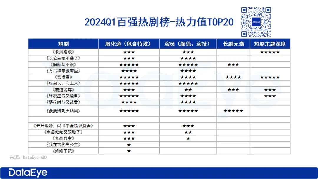 从第一季度古装题材短剧的表现来看,本节摘取热力值排名前十,以及末尾五部短剧,从服化道、演员、是否融入长剧元素以及短剧主题深度四方面进行分析,看看这些剧爆在哪里。以下是小编个人刷剧评分。