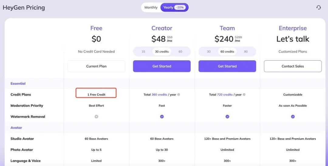 HeyGen 订阅页面,注:免费版 HeyGen只能生成 1 个视频,基本无法满足使用需求