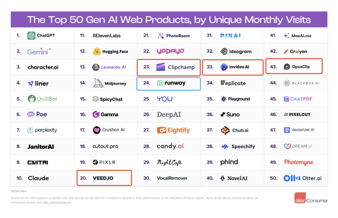 而在上述几个领域中,AI 视频生成产品的用户接受度最低。在 a16z 刚刚发布的 2023 下半年 Top50 AI 产品榜单中,上榜的 5 款 AI 视频产品中,只有 runway 一款是以视频生成为核心功能的,其他都是刚需属性更强的视频编辑产品。