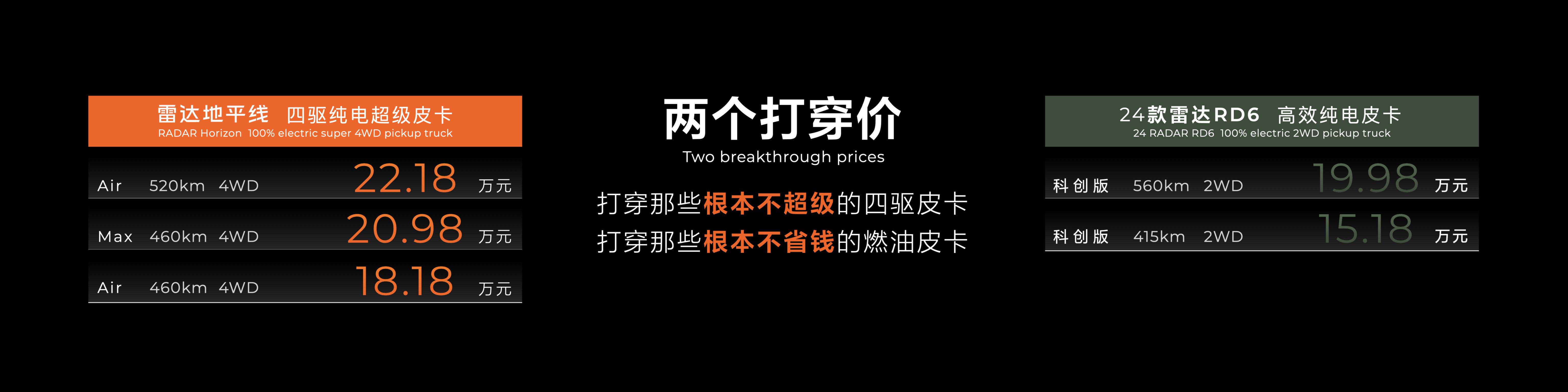 论参数和性能,雷达地平线在综合竞争力上并不比特斯拉的Cybertruck差什么,而在场景化的应用方面又要胜于它,更重要的是与Cybertruck相比,雷达地平线的价格优势非常明显,雷达造了一台让大家都买得起的国民皮卡,让皮卡真正摆脱了工具属性,向多元化生活载体的定位转变。
