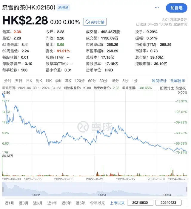 此后,奈雪的茶股价连跌三年,截至4月23日,报收于2.28港元,总跌幅超过88%,市值蒸发超285亿港元。