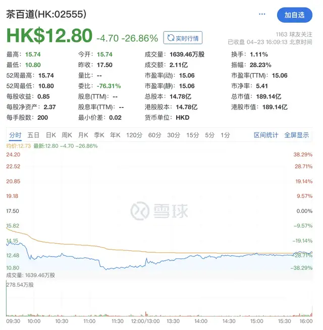 上市首日,茶百道开盘价为15.74港元,较发行价17.5港元下跌幅度达10.06%;此后,茶百道的股价连续下跌,一小时内跌幅超过30%,23日中午收盘为11.34港元,已跌35.20%。