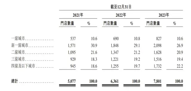 2019年,茶百道年加盟店破600家,2020年扩张到2242家,2021年开出2835家,2022年1284家。截止到2023年末,茶百道门店总数量飙升至7801家,较2016年的100家,已翻了不止70倍。