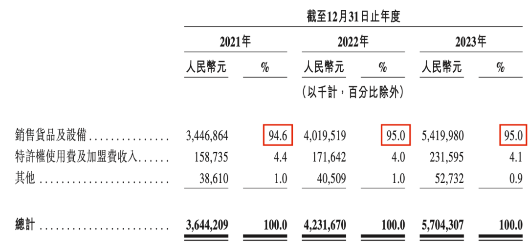 其中,货品及设备销售是茶百道最核心的收入来源,占其营收的95%左右。4%左右的营收来自特许权使用费及加盟费。