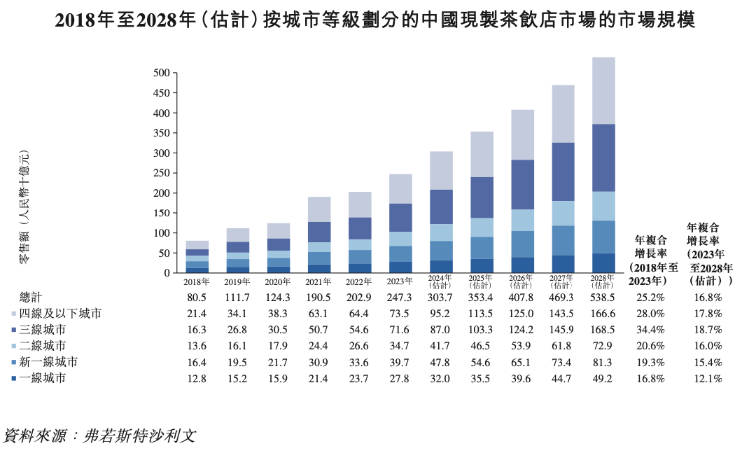 弗若斯特沙利文报告预计,2023年至2028年,二线城市、三线城市、四线及以下城市的现制茶饮店市场预计将分别以16.0%、18.7%及17.8%的年复合增长率持续增长。