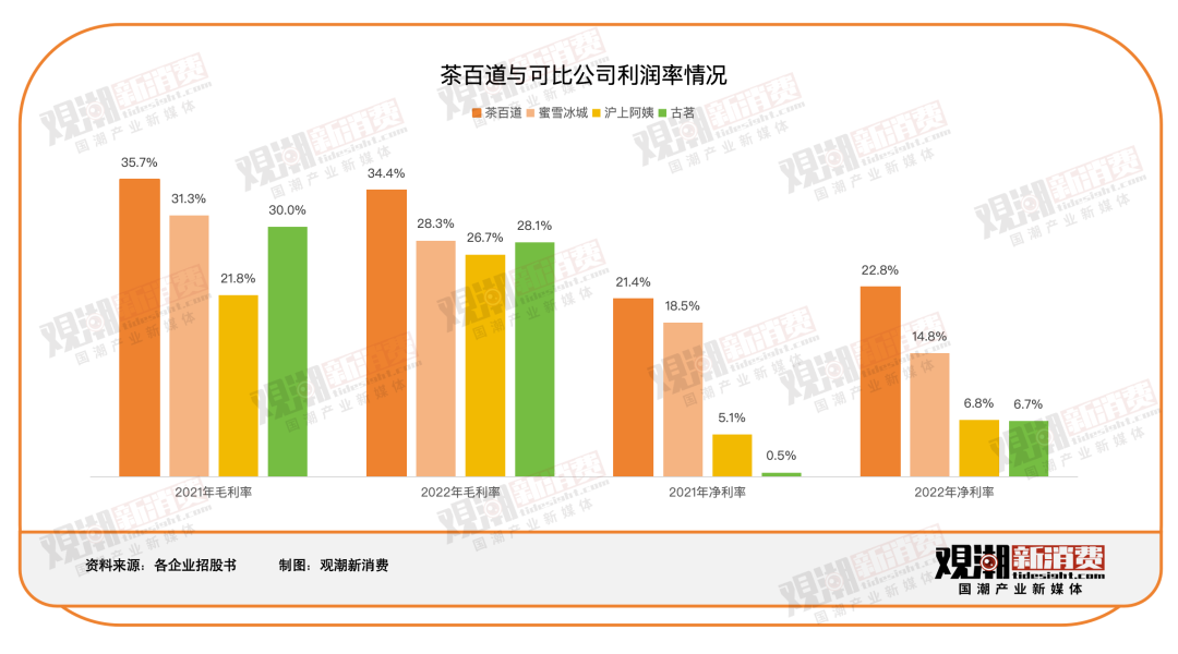 2020—2023年,茶百道毛利分别为3.97亿元、13.01亿元、14.56亿元、19.64亿元,同期毛利率分别为36.7%、35.7%、34.4%及34.4%;净利润分别为2.38亿元、7.79亿元、9.65亿元、11.51亿元,净利润率分别为22.0%、21.4%、22.8%、20.2%。