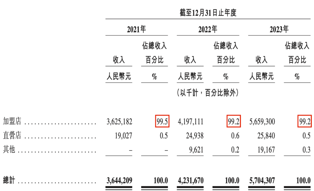 截至2020年、2021年、2022年、2023与最后实际可行日期,茶百道直营店的数量分别为2间、7间、9间、6间、6间,加盟店均占当期在营门店总数的99%以上。