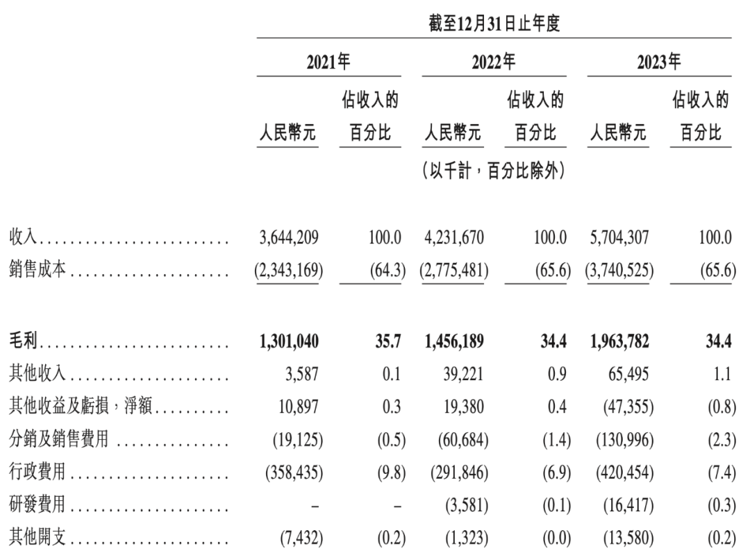 综合茶百道招股书与聆讯后资料集中的数据,2020—2023年,茶百道的营收分别是10.8亿元、36.4亿元、42.3亿元、57.0亿元,2023年在销售成本比例不变的情况下,营收同比增长率由2022年的16.1%增至34.8%。
