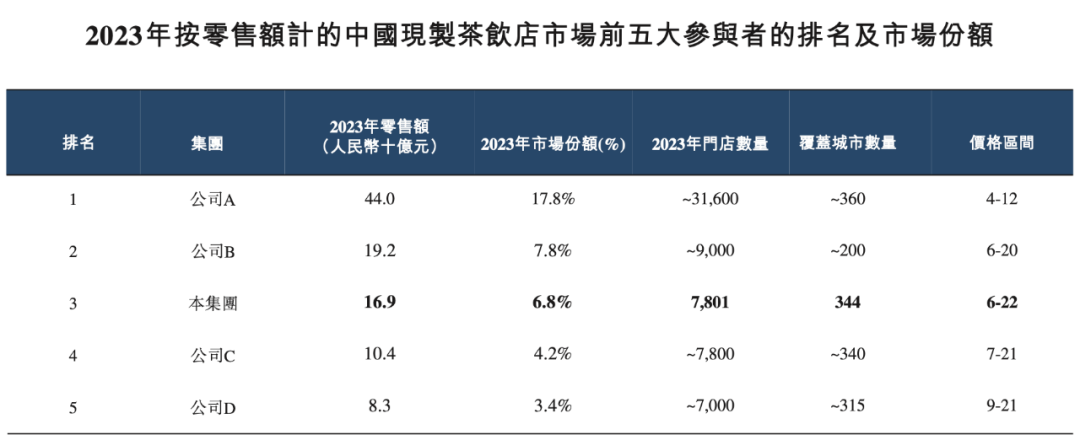 弗若斯特沙利文的报告数据显示,2023年,按零售额计,前五大参与者合计共占据约40%的市场份额,茶百道排名第三。