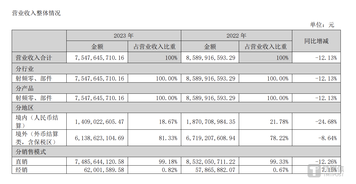 从地区上来看,信维通信的销售市场主要是面向海外,海外营收的比重超过8成。据2023年报显示,报告期内,公司的境内外收入均出现下滑,其营收分别为14.09亿元、61.39亿元,同比下滑了24.68%、8.62%,其中境内市场的收入下滑幅度较大。