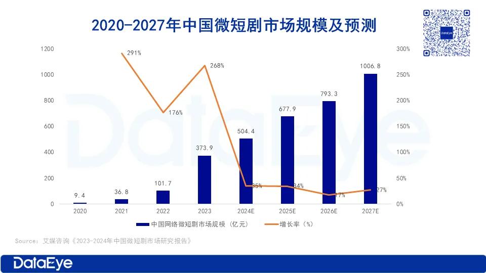 据艾媒咨询数据,2023年中国微短剧市场规模达373.9亿元,预计2024年达500亿元,2027年超1000亿元。