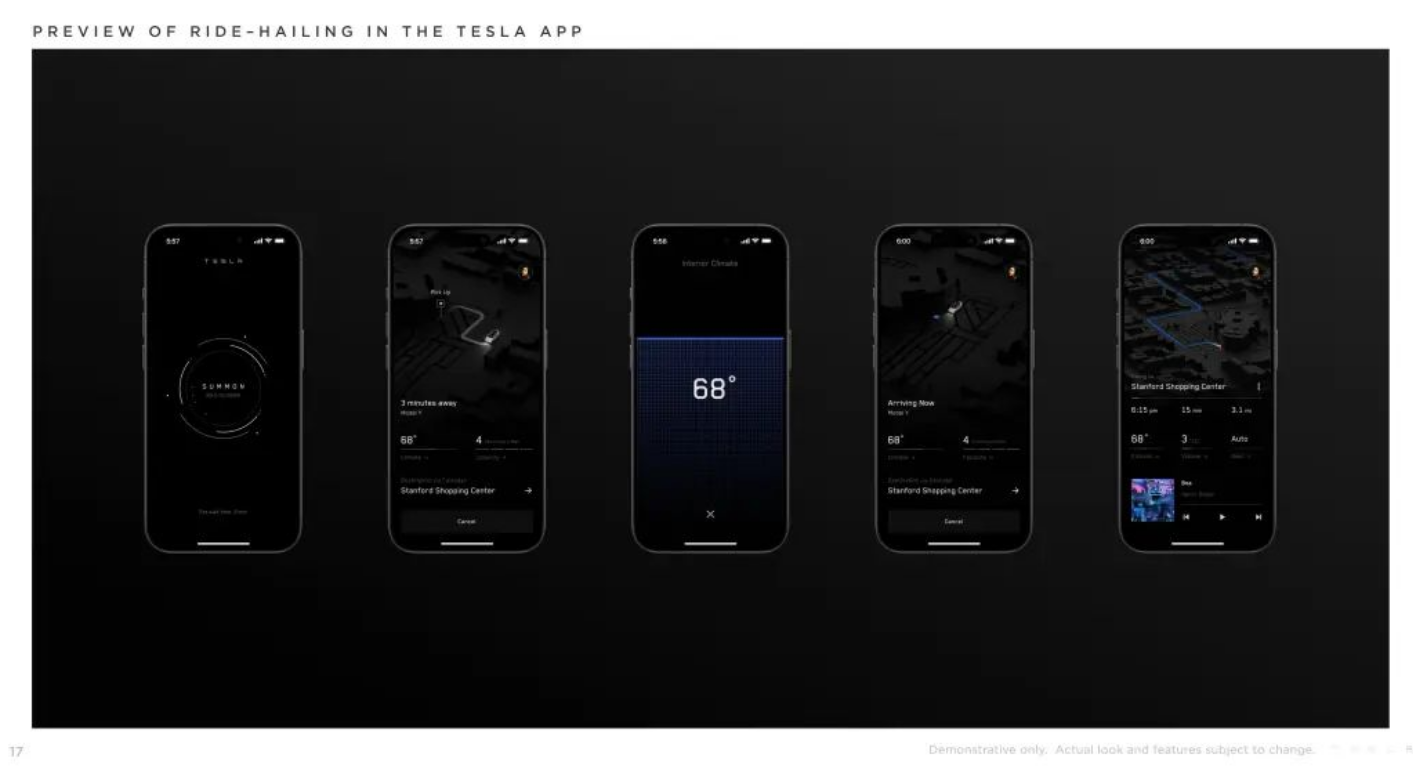 除了加速入门车型开发,马斯克在电话会议中还表示,预计将于今年8月份对外展示专用于机器人出租车Robotaxi产品,将其称为“Cyber Cab”,可能会用于特斯拉出租车的官方命名。同时,特斯拉还在财报当中展示了自家打车App的预览图。