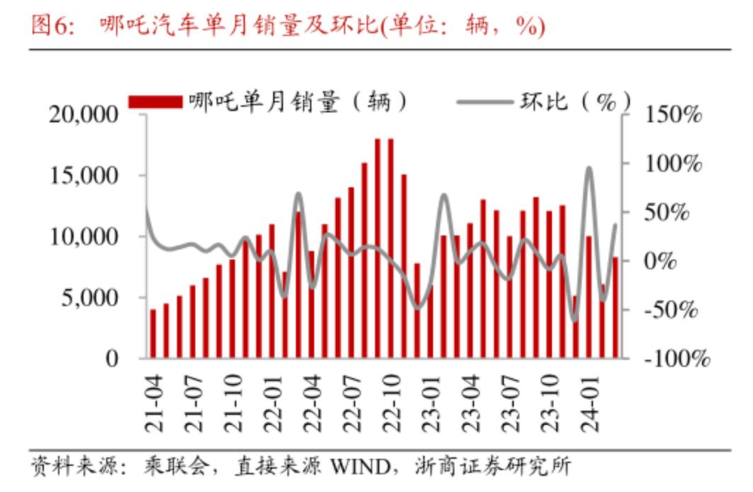 哪吒汽车销量自2022年10月达到顶峰后持续性单月下滑,图源浙商证券