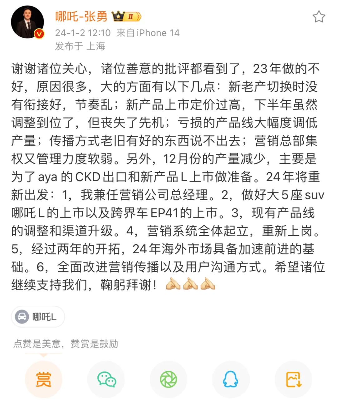 张勇此前公开发文反思哪吒汽车存在的问题,图源张勇个人微博