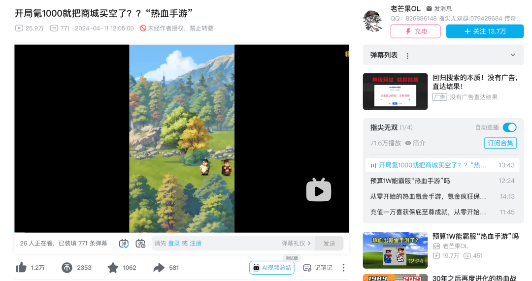 一些游戏行业游戏达人,也开始主动安利小游戏,比如近期我们观察到up主芒果冰在B站发《指尖无双》小游戏视频,播放高达25.9万,还建了玩家群。
