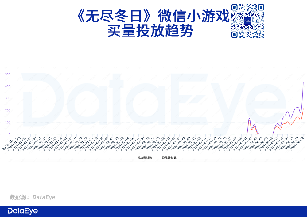 头部:点点互动《无尽冬日》4月中旬快速攀升,一跃到畅销榜第2第3。同时,蓝琥珀《指尖无双》则是持续稳步攀升,从70名左右爬到了畅销榜第6。而江娱《口袋奇兵》则受到了一定挤压,排名先略微下滑,而后又回升。头部洗牌明显。头部飙升较快的《无尽冬日》、《指尖无双》,买量投流都呈现快速提升态势。ADX数据显示:两款微信小游戏计划数、素材数近期陡然上升,每天都在创新高。《无尽冬日》4月22号投出视频+图片210素材,对应435计划。《指尖无双》投出视频+图片1041素材,对应2623计划。