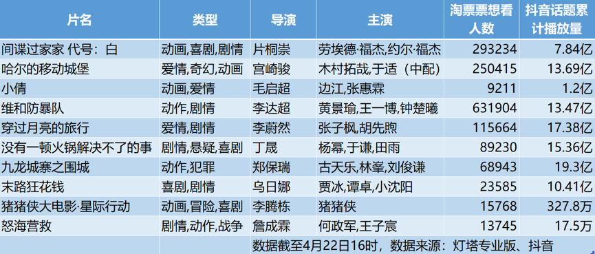 4月上映了日本动画《你想活出怎样的人生》《哈尔的移动城堡》《间谍过家家 代号:白》《数码宝贝02:最初的召唤》,此后还将有《哆啦A梦:大雄的地球交响乐》、《机动战士高达SEED FREEDOM》、《排球少年!!垃圾场决战》进入市场,日本动漫IP正在加速成为国内院线进口片的主角。