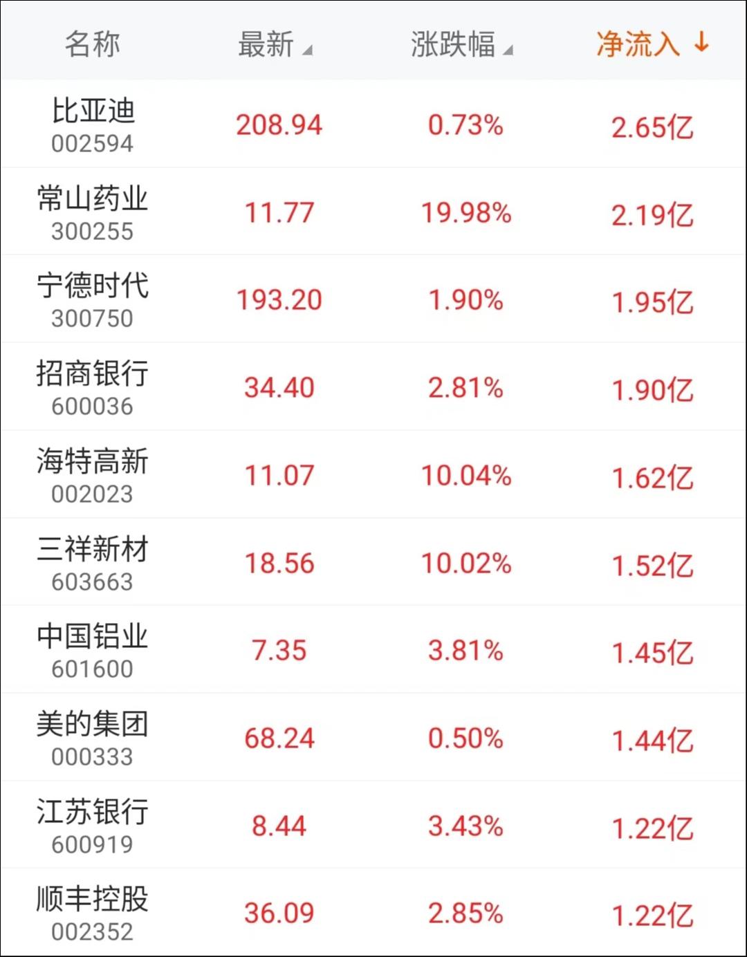 主力资金净流入最高的个股为比亚迪,流入资金2.65亿元,其次是常山药业,主力资金净流入2.19亿元。
