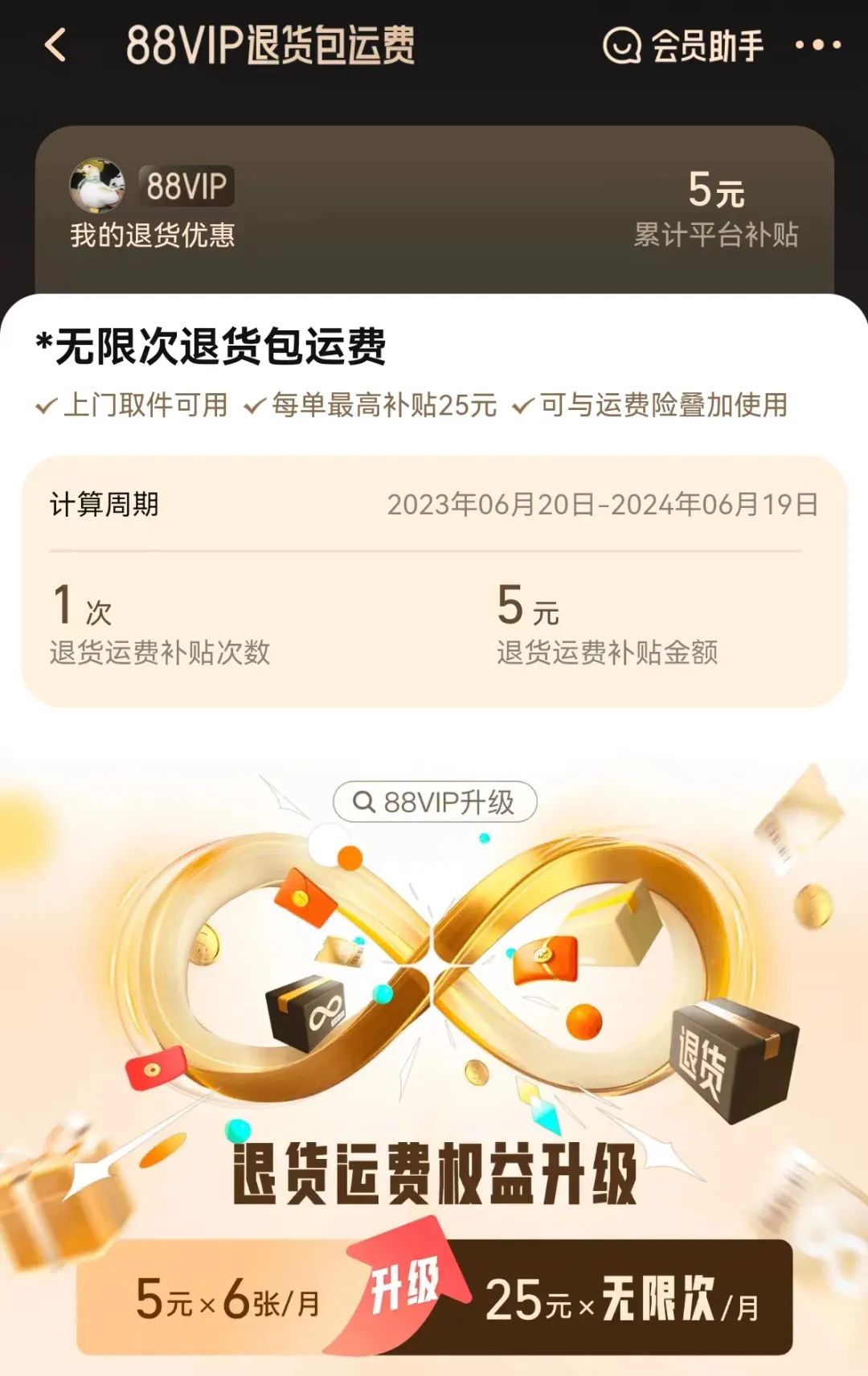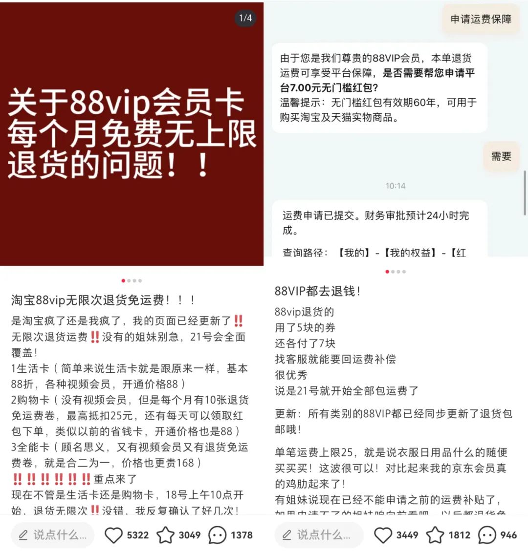 今年年初,淘宝88VIP升级推出三种权益卡,其中购物卡便包含了每月10张25元运费券。本次,伴随88VIP权益的进一步升级,用户退货难的问题得到了进一步解决。