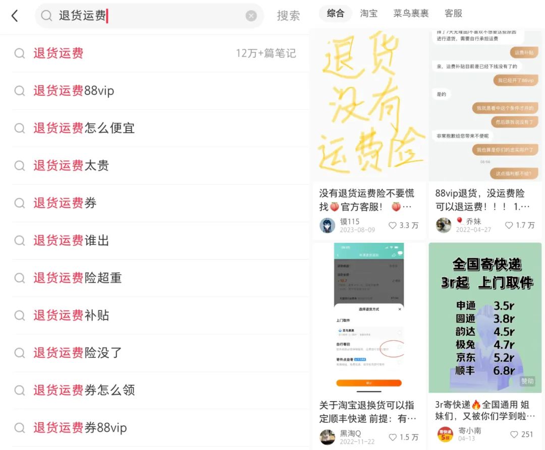 今年4月发布的《2024电商消费者权益热点趋势》报告中指出,消费权益核心四大关键词中,极速售后是用户提升幸福感的关键。而售后中,退货运费一直是大量用户的“心病”。小红书站内,“退货运费”相关笔记高达12万+,“网购退货攻略”、“无理由退货要自付运费怎么办”、“没有退货运费险怎么办”等帖子都是话题下的高赞内容。