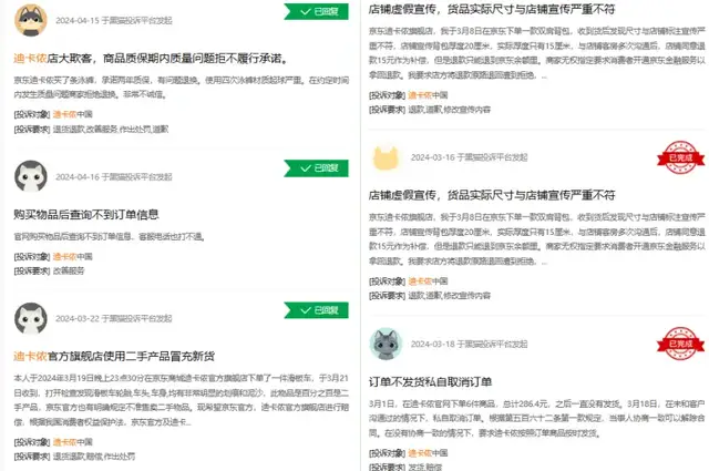 在黑猫投诉平台上,关于迪卡侬中国的投诉超900条,投诉内容涉及虚假发货、产品质量问题、退货难、客服态度恶劣等。