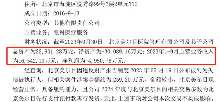 尽管光正眼科对于美尔目医疗充满期待,但美尔目医疗目前的处境却同样极为糟糕。截止2023年9月底,美尔目医疗总资产2.29亿元,而净资产却为-3亿元;2023年1-9月,公司整体营收为1.65亿元,可却录得4950.76万元的亏损。更为让人失望的是,美尔目医疗还于2023 年 05 月 19 日被列为失信被执行人。