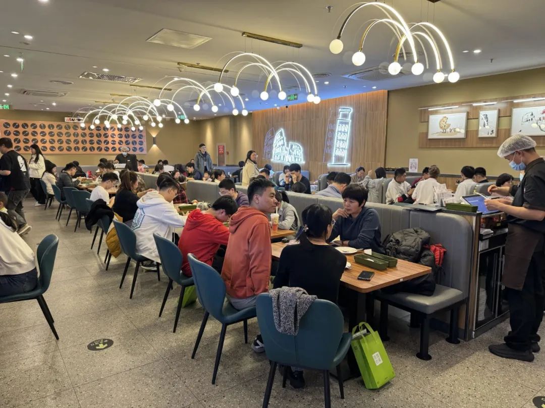 餐观局在新奥天虹探店期间,整个店内晚高峰期员工大约12人左右,正式员工2-3人,小时工8-9人,前厅后厨分配比例5:5左右。