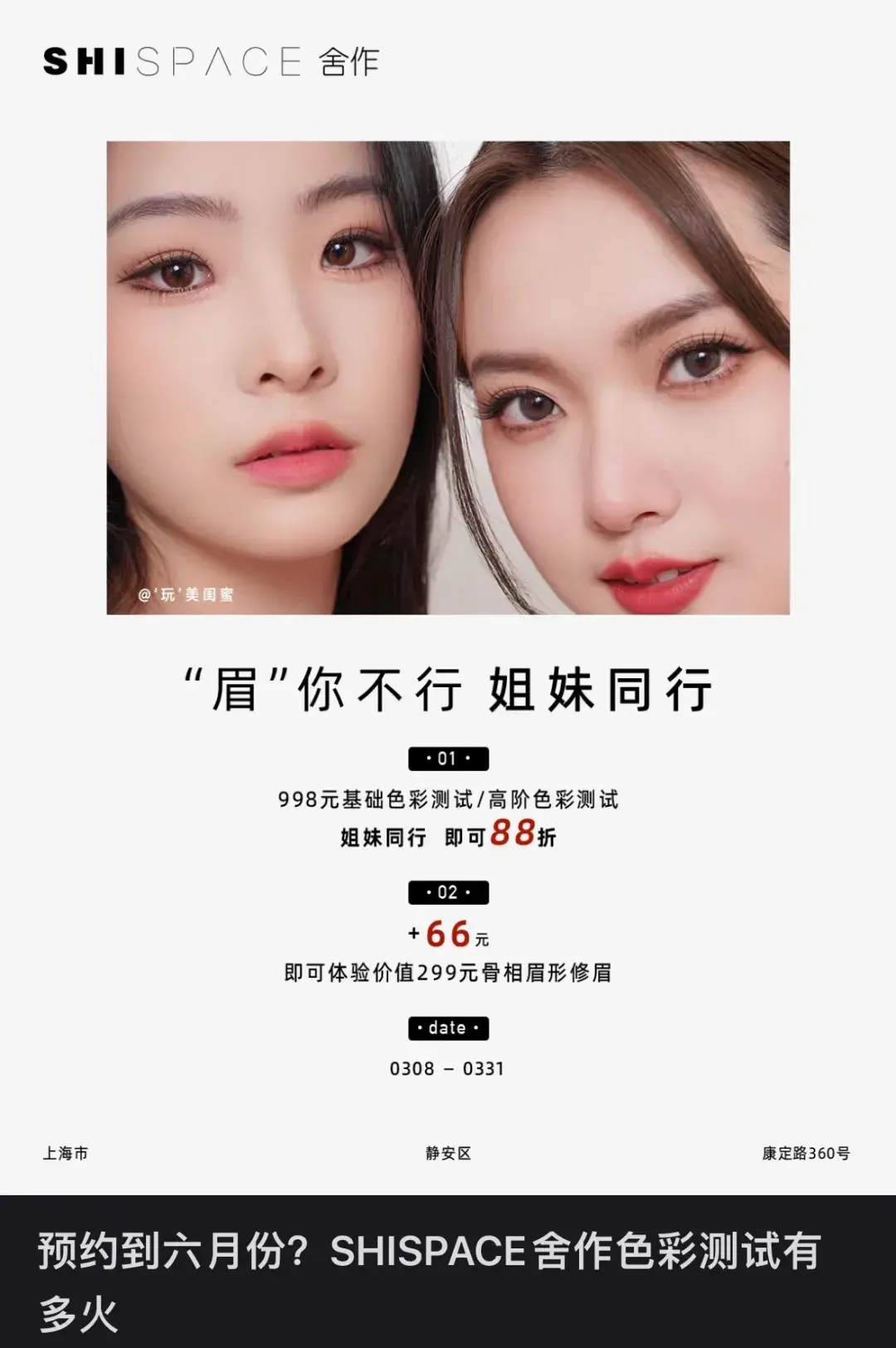 在热闹的出圈下,“SHISPACE舍作”凭借着销量最高色彩测试收割了一大批消费者。而所谓色彩测试是通过分析个人的肤色、发色和瞳孔颜色之间的关系,为顾客找到适合自己的穿衣打扮色彩搭配规律。在商品详情里,该项目包括“高阶冷暖四色评估、整体形象风格设计、日常妆(试营业福利)”,服务时间为120分钟。