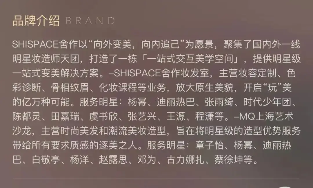 大众点评信息也显示,其服务明星有杨幂、迪丽热巴、张雨绮、时代少年团、陈都灵、田嘉瑞、虞书欣、张艺兴、王源、程潇等,主打明星同款的专业团队提供专业化服务。