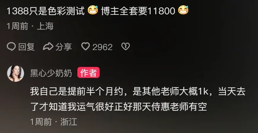 根据博主@黑心少奶奶在评论区的分享,1388和1580的色彩测试和定制妆容只是入门级消费,像博主这样从发型、妆造、穿搭等等完整体验一套服务的费用可能超过1万元,这样的高昂价格使得普通消费者感到难以承受,特别是在人均1500元的低价宣传下,这种价格差异让消费者感到被误导。