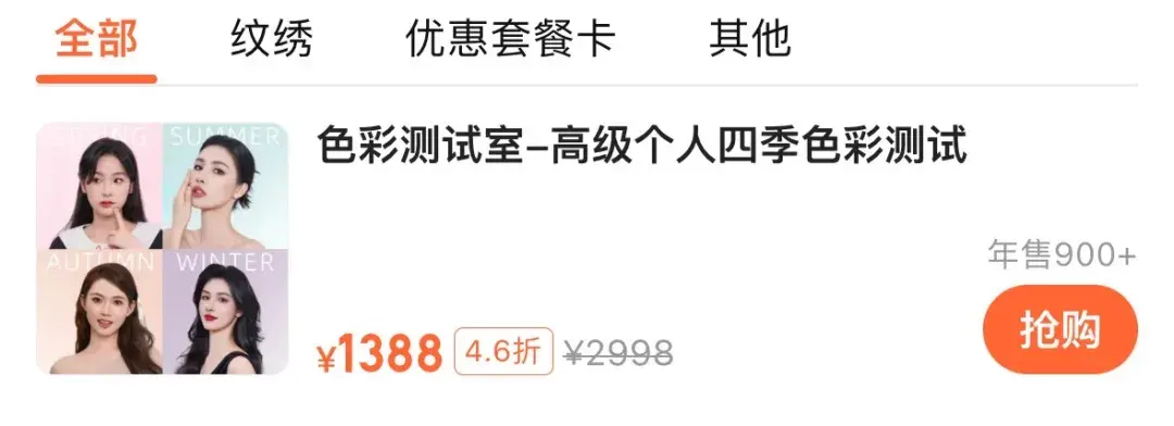 值得关注的是,“SHISPACE舍作”定价不菲,远超上海妆造店铺。根据大众点评APP,“SHISPACE舍作”的人均消费约为1492元,其中“高级个人四季色彩测试”团购价为1388元,销量已超过900份,也就意味着仅色彩测试一项已卖出超百万元。