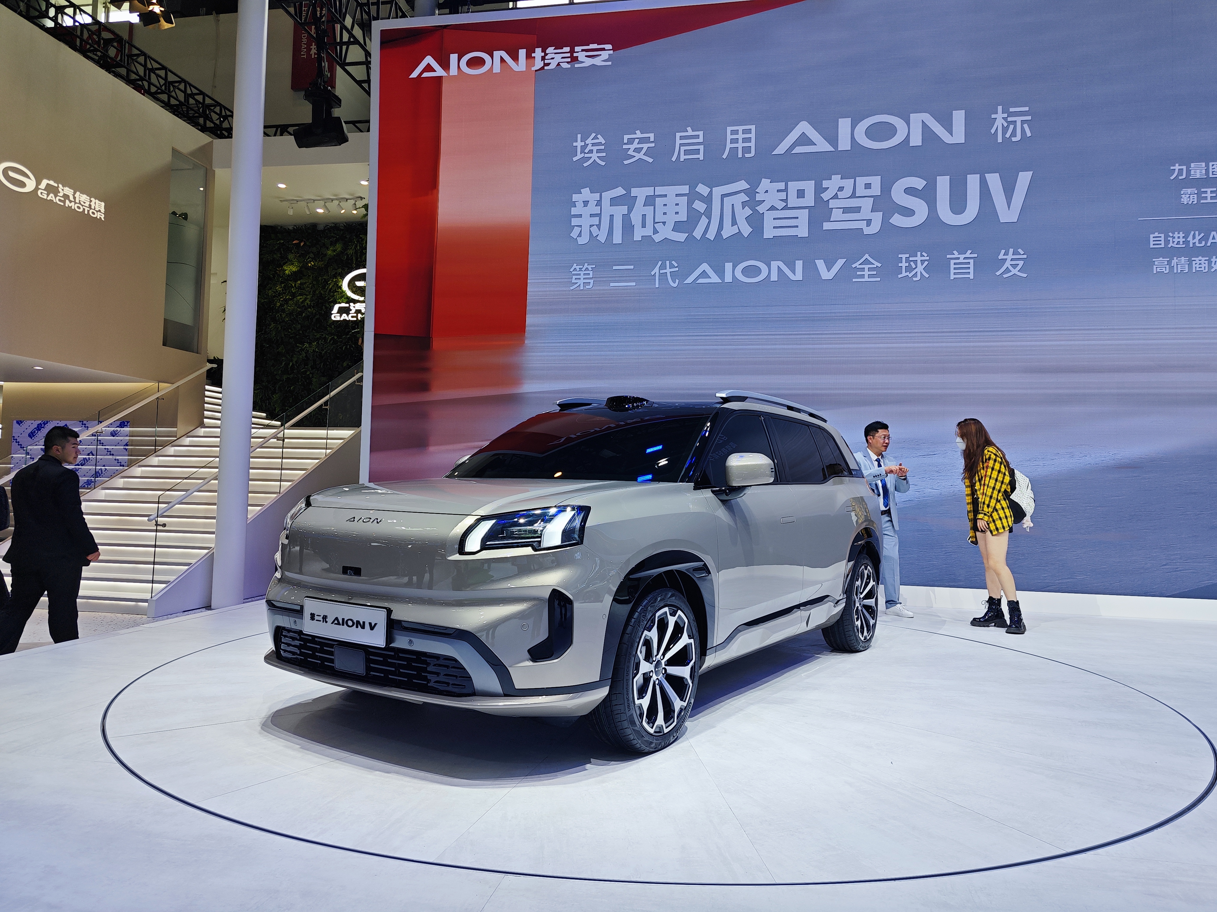 北京车展前夕曝光的第二代AION V也来到了车展现场,新一代AION V用上了全新的设计语言和新的AION车标,城市SUV带了一点硬派车型的线条,比现款精神了许多。更令我好奇的是,第二代AION V的定位是“新硬派智驾SUV”,车顶上多了一个瞭望塔式激光雷达,看似将智能驾驶放在重点位置。