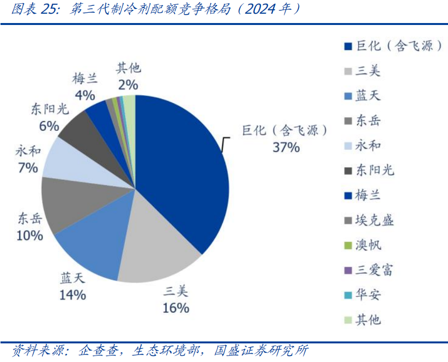 其他企业中,东岳集团R32配额行业占比较高;中化蓝天争取到了较高的R134a、R125配额;三美股份的R143a、R134a配额占比较高;永和股份R143a配额占比较高。