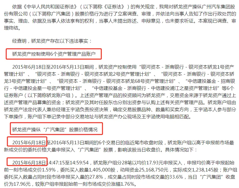 但从广东证监局的处罚文件透露的具体信息来看,早在2015年6月18日起,骄龙资产就已开始操纵广汽集团的股价,而当时王德亮还是骄龙资产的实际控制人。