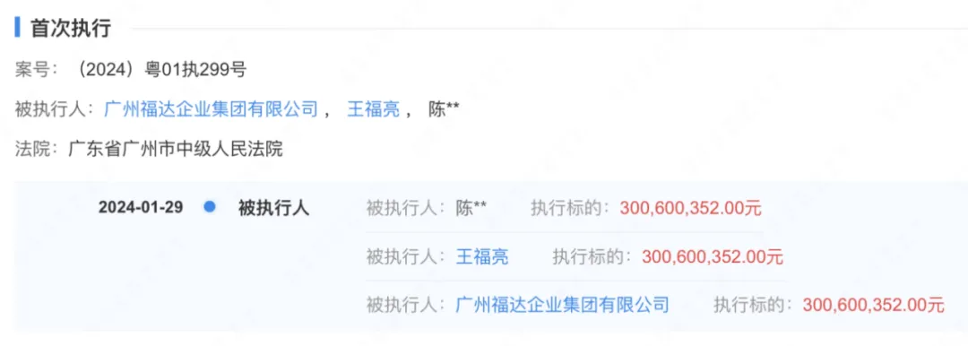 据天眼查及企查查信息,今年1月,王福亮及其持股80%的广州福达企业集团有限公司被广东省广州市中级人民法院列为被执行人,执行金额超3亿元。广州福达及法定代表人也都被限制高消费。