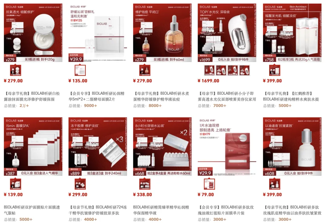 时代周报记者通过搜索“BIOLAB听研”品牌名称找到了其天猫旗舰店,其热销产品为面膜及精华液,均价接近300元。