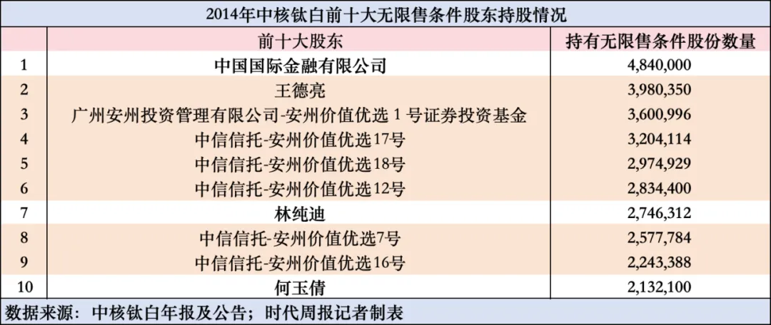 时代周报记者发现,早在中核钛白2014年报中,王德亮的名字就出现在了前十大无限售条件股东名单第2名,持股398万股仅次于中金公司。而在十大无限售条件股东名单中有六个都与王福亮旗下的广州安州投资管理有限公司有关,其中5个是通过中信信托成立的集合资金信托计划参与。
