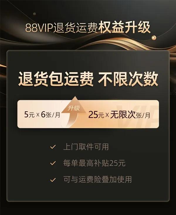 这次又升级了一项重大会员权益。淘宝天猫宣布,4月22日起,88VIP会员可以享受无限次退货包运费,每单最高补贴25元,并且可与运费险叠加使用。在此之前,88VIP会员每月可享受6张5元退货券,但超出部分需要自费。