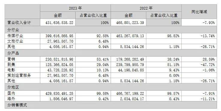 市场表现直接牵连着公司业绩,2023年百纳千成电影板块业务营收占比较去年只增长了不足1个百分点,总营收金额不增反降,占公司总营收仅有百分之十。