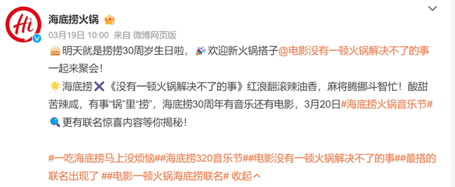 早在3月19日,海底捞30周岁生日之际,就官宣与《没有一顿火锅解决不了的事》达成合作,后续开启一系列联动活动:在淘票票购电影票可以获得海底捞锅底或菜品券,主创去海底捞线下门店快闪,打出“看完《火锅》吃火锅”这种极具社交属性的标签。