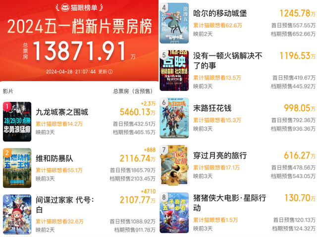 从类型题材上看,供给算是丰富:主旋律动作大片《维和防暴队》、黑帮热血番动作片《九龙城寨之围城》、开心麻花喜剧片《末路狂花钱》、悬疑喜剧片《没有一顿火锅解决不了的事》、日本人气动画电影《间谍过家家 代号:白》、宫崎骏经典IP《哈尔的移动城堡》、爱情片《穿过月亮的旅行》和亲子向动画片《猪猪侠大电影》,每一部看上去都不算“炮灰”。