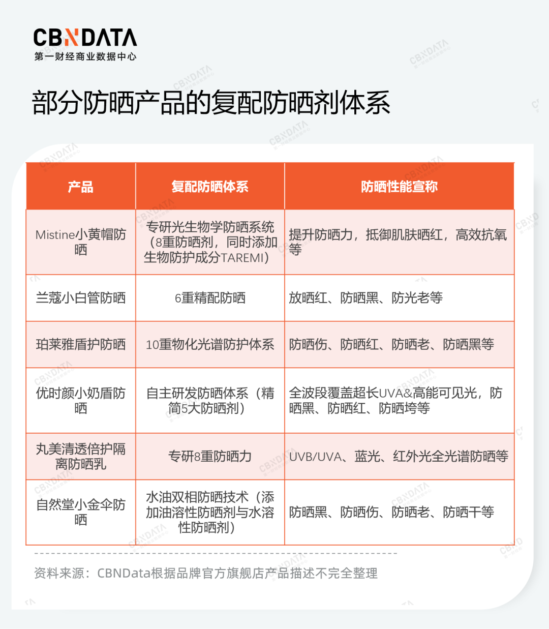 如今无论是消费者还是各个品牌,对防晒的关注都深入到配方、工艺、科技层面。市场更加认真考量不同防晒剂的应用与需求走向。一个共识是,单一防晒剂通常较难开发出高效的防晒产品,需要以多种防晒剂进行复配从而达到更好的广谱防晒效果。其中,“物化结合”的复配防晒剂由于在多个波段都有比较好的防护能力,同时兼具较好的肤感,在很多品牌中都有应用。在此基础上,各家的差异主要在于防晒剂类型的选择及其具体配方、防晒技术。无论是“老牌选手”还是“新人玩家”,纷纷拿出“专研”“独家”的防晒配方体系。例如,Mistine王牌单品小黄帽防晒采用的是8重防晒剂与其生物防护成分TAREMI,后者也被称为其“灵魂成分”,具有协同抵御作用;兰蔻小白管防晒采用了欧莱雅集团知名的麦色滤防晒科技,能够保护皮肤抵御超长波UVA的伤害。