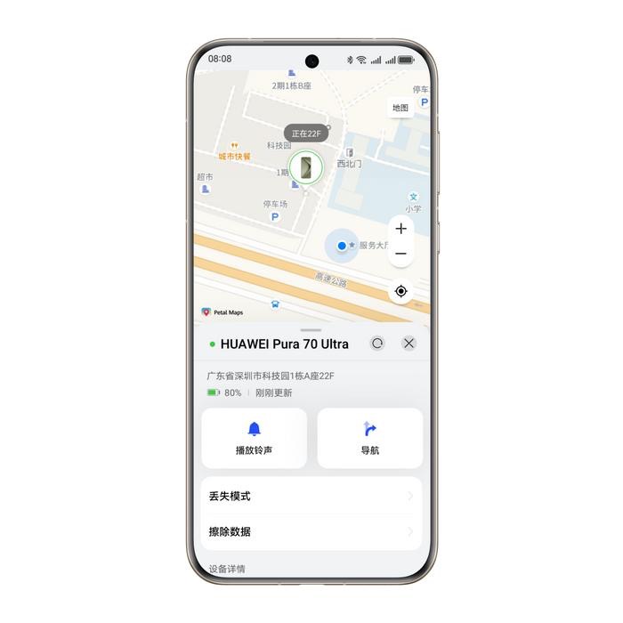 华为的查找设备功能和大多数品牌一样,也支持电量耗尽前发送最后一次的定位、位置共享等功能,同时也能显示同一个华为账号下的所有设备的位置。此次华为Pura 70系列更新了「楼层级设备查找」功能,即能显示设备在具体楼层的定位,但官方数据显示,目前仅支持1万余个主流城市的超商、车站、机场等客流量较大的公共场所。