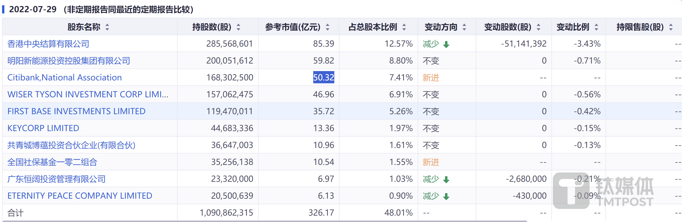 除了上述两名股东之外,公司的第五大股东Citibank,National Association(下称Citibank)也在连续减持。2023年年初,Citibank持有公司7158万股股票,持股比例为3.15%,为公司的第五大股东。
