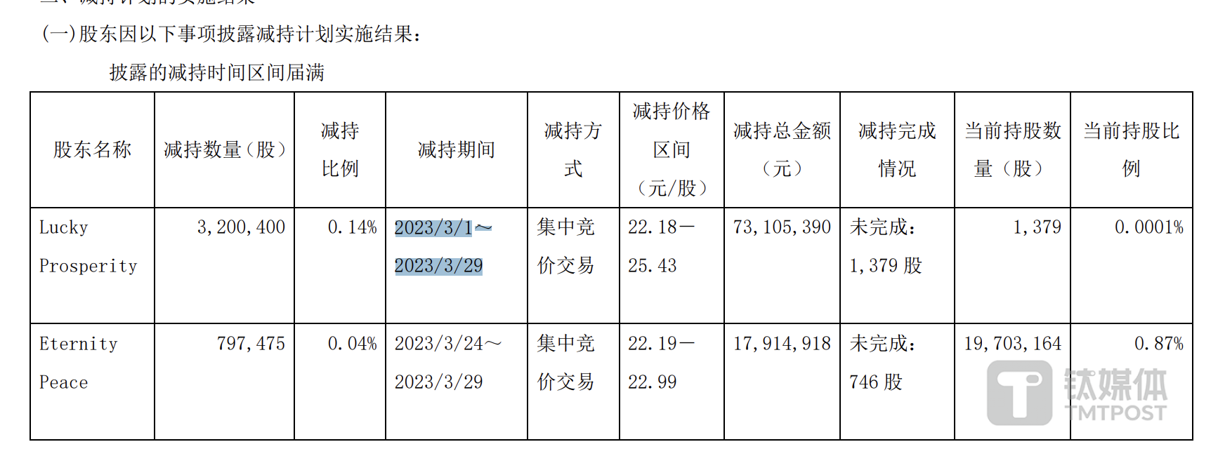 据公司2023年6月发布的股东减持股份结果公告显示,公司两名股东Lucky Prosperity Company Limited(下称Lucky Prosperity)和 Eternity Peace Company Limited(下称Eternity Peace)在2023年3月,分别减持公司320万股和79.75万股,分别套现7311万元和1791万元,合计套现9102万元。